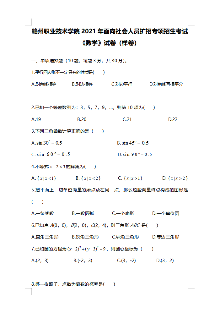 本大纲根据江西省教育厅《2021年度江西省高等职业院校扩招专项工作实施方案》、《德赢Vwin官方区域合作伙伴2021年面向社会人员高职扩招专项招生简章》、《赣州职业技学院2021年面向社会人员专项扩招招生章程》等文件要求,面向社会人员(退役军人、下岗职工、农民工、高素质农民等)招生考试,以测试其职业适应能力和学习潜力为目的而制定。