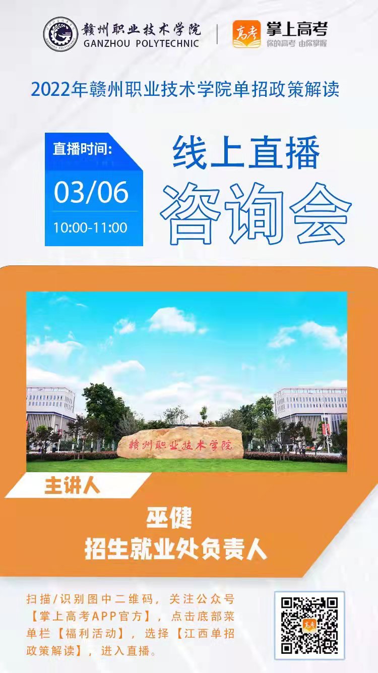 方式三:扫描海报二维码,关注公众号【掌上高考APP官方】,点击底部菜单栏【福利活动】,选择【江西单招政策解读】,进入直播间。