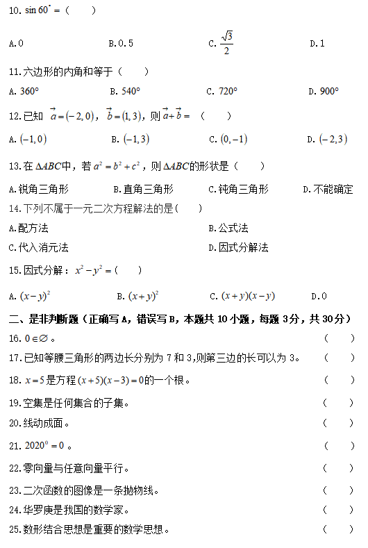 二、是非判断题(正确写A,错误写B,本题共30小题,每题3分,共90分)