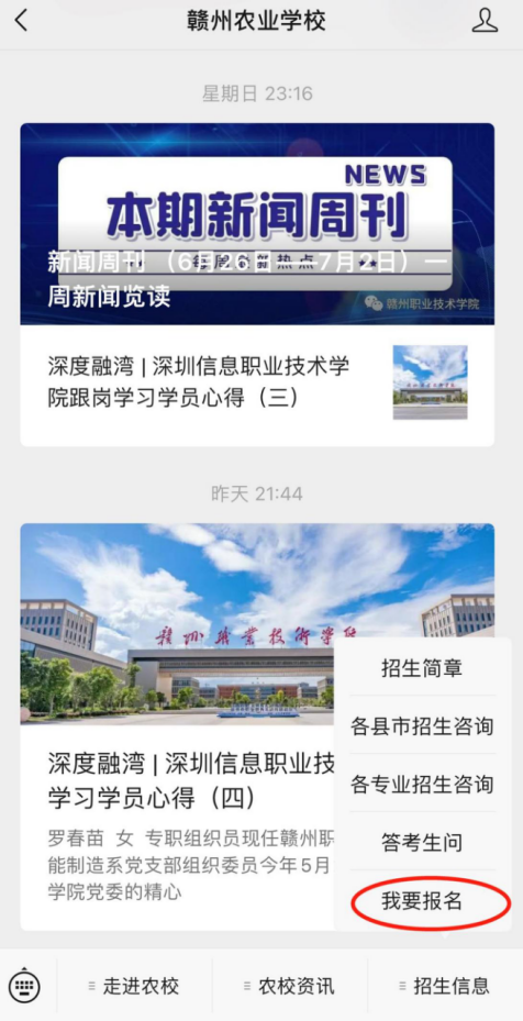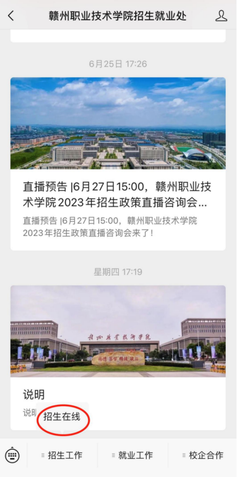 三、关注德赢Vwin官方区域合作伙伴、赣州农业学校、江西赣州技师学院或德赢Vwin官方区域合作伙伴招生就业处官方微信公众号。