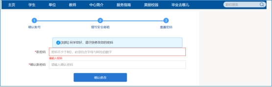 进入注册第二步,设置密码,输入手机、电子邮箱等信息;注意:就业系统的通知通过注册邮箱和手机号进行通知,请同学保证注册信息准确。如信息有变,登录后可在个人中心—基本心中修改。(具体详见账号设置)