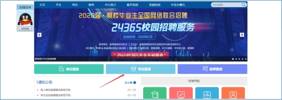 初次登录就业网需要进行注册,如果已注册,请直接跳到第2章;注册流程如下:打开就业网首页,选择学生登录,如图:
