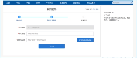 输入正确的注册邮箱,点击“发送验证码至邮箱”,系统会给注册邮箱发邮件,打开邮件,获取邮箱验证码,输入,点击下一步,打开设置新密码页面如图: