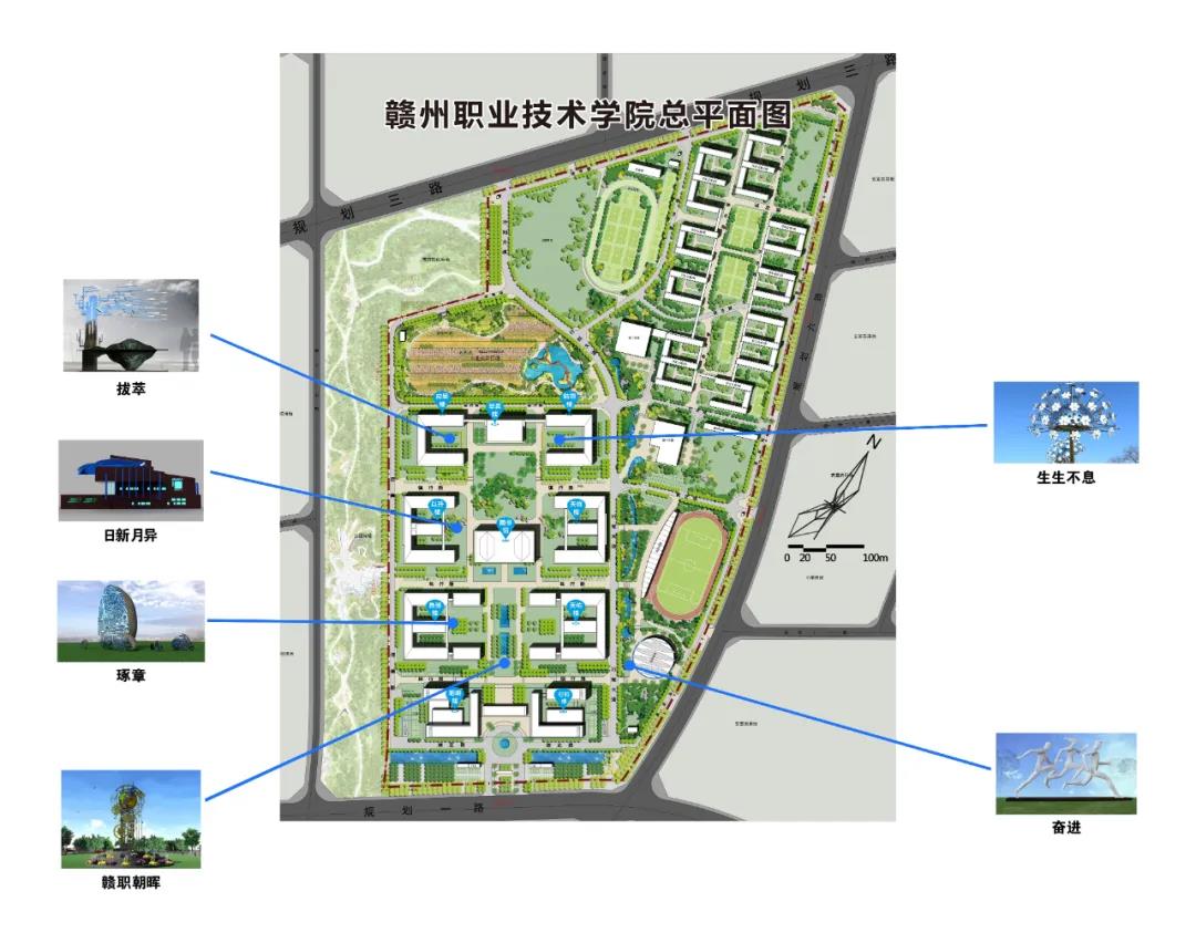 校园主要道路约有16主干道。围绕高校的“立德树人”的根本任务和职业院校“笃行精技”的办学特点,并结合教育学家陶行知提出“行是知之始,知是行之成”的教育初心和阳明文化中的“知行合一”,提炼出“德”“行”“思”三个主题元素。在主题实体呈现上,按校园功能区划分,校园主干道及四周环线路段为“德”元素区;教学区为“行”元素区,生活区为“思”元素区。