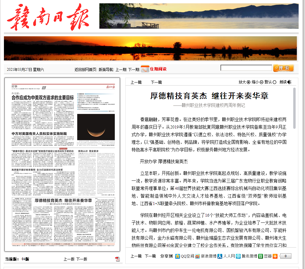 当前,全球新一轮科技革命和产业变革蓄势待发,以中国为代表的新兴科技强国正在努力向科技产业变革的第一方阵进发,职业教育承担着为科技革命和产业变革培养大量高素质技术技能人才的重任。未来,德赢Vwin官方区域合作伙伴将以重于泰山的使命感,只争朝夕的紧迫感,逆水行舟的危机感,紧紧抓住发展机遇,坚持正确的办学方向,坚持立德树人,全面提高人才培养能力,秉承优良传统,借鉴先进经验,发掘自身优势,迎接新挑战、开拓新境界、实现新突破、重攀新高峰、再创新辉煌,谱写学院事业发展的新篇章。(曾卫平 刘丹 谭辉)
