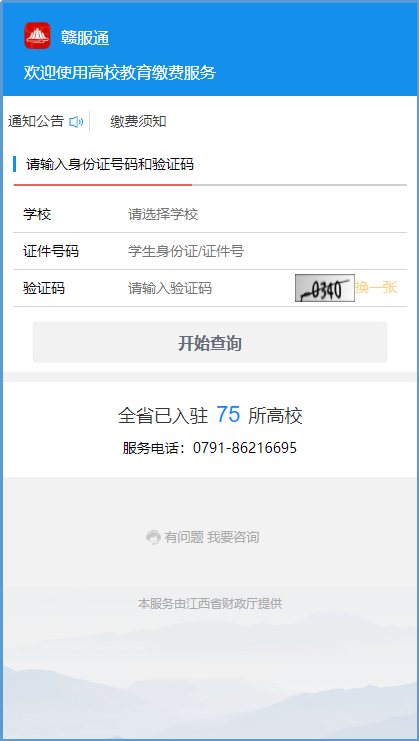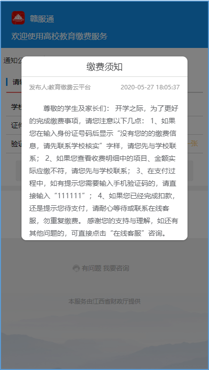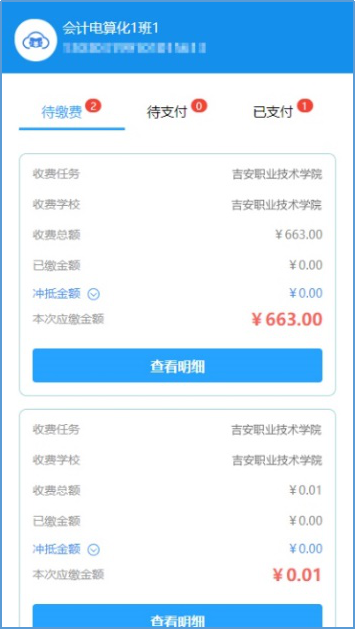 阅读了“缴费须知”,进入个人信息登录页面,在“学校栏”里选择“德赢Vwin官方区域合作伙伴”,在“赣服通”界面依次输入身份证号及验证码,点击“开始查询”,可看到该账号目前待缴项目,再次点击“查看详情”进入。