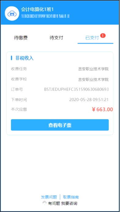 在“已支付”订单里,点击“查看电子票”,即可获取电子票(非税电子票和往来电子收据),可下载保存图片或自行打印电子发票。