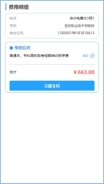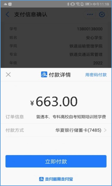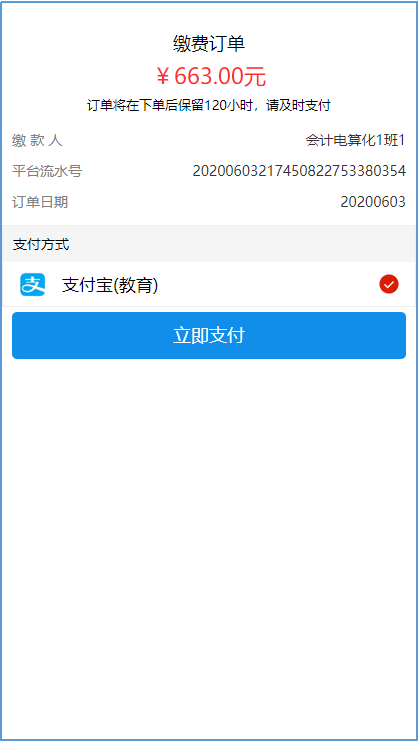 确认费用明细没问题后,点击“立即支付”,再次确认缴款人信息无误后,选择支付宝支付,付款方式可选择“余额”或者绑定的银行卡支付,即可完成缴费。