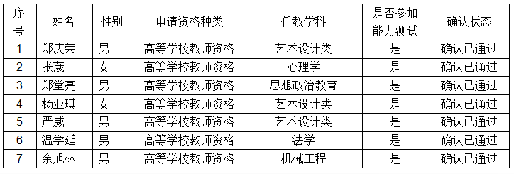 根据《关于做好2022年下半年全省普通高等专科学校和成人高等学校教师资格认定工作的通知》要求,现对学院现场确认通过人员进行公示,具体如下: