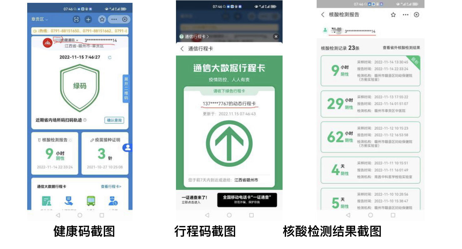 上传三项截图要求:1.必须为上传当天的截图。2.三项截图中必须有对应人员的相关信息(如下面三图中划红线部分所示)。3.核酸检测结果的截图必须和示例图片一致。