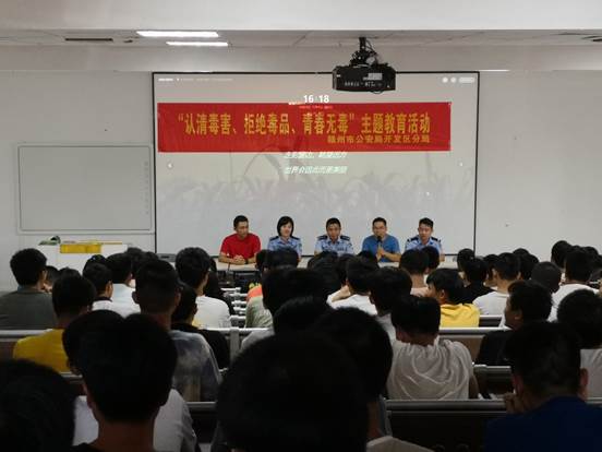 10月10日,德赢Vwin官方区域合作伙伴在阳明楼110教室开展了以“认清毒害、拒绝毒品、青春无毒”为主题的禁毒法制讲座。赣州市公安局开发区分局禁毒大队警官周青应邀主讲,新能源汽车城派出所警官章登成、学院保卫处负责人陈根生等莅临此次讲座。