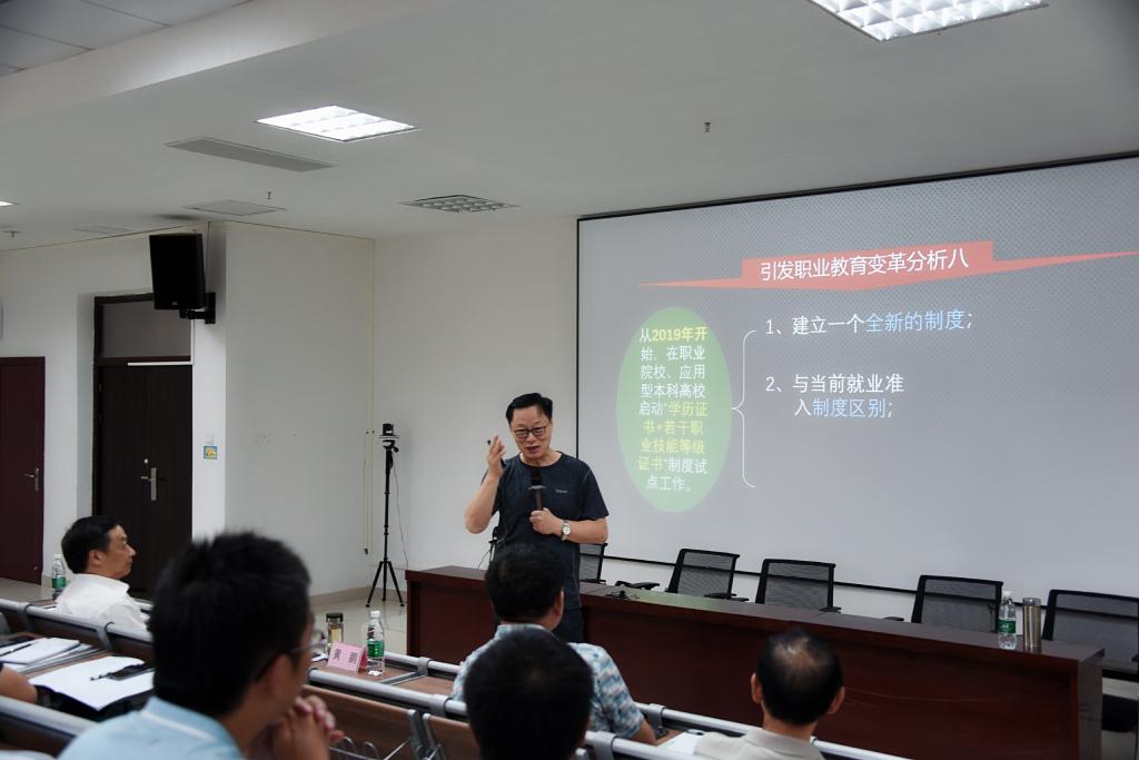 9:00,中央电教馆精品课建设专家组长,中国国际科学交流促进协会理事,中国高等职业教育研究会教学研究与资源建设委员会顾问魏民给我们授课《关于“学‘职教20条’精髓,看职教创新发展趋势”》,魏教授带领我们阅读并分析了《职教20条》原文内容,深刻剖析了《职教20条》的精髓及职业院校面临的机遇和挑战,整个教学过程绘声绘色,课堂期间,魏教授还下到座位和教师们进行亲切的互动,幽默的教学方式给教师们留下了深刻的印象。
