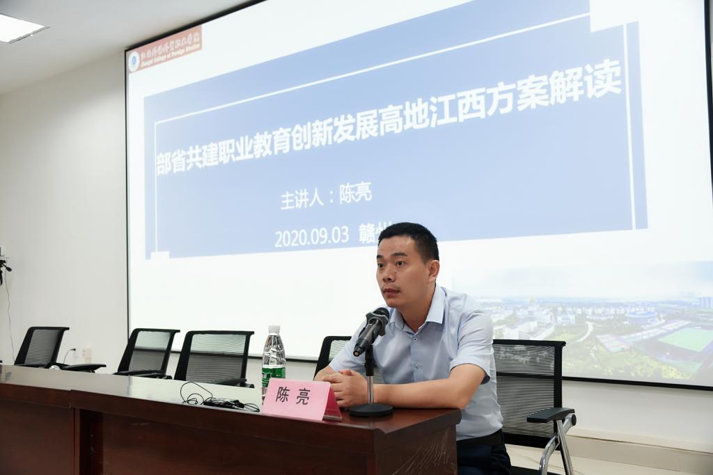 下午2:30,江西外语外贸职业学院教务处副处长陈亮教授对《江西省人民政府关于整省推进职业教育综合改革提质创优的意见》进行了具体的文件解读与经验分享。陈教授对文件的背景与思路、目标与举措、亮点与特色以及机遇与使命进行了重点的分析与解读,并充分强调了政府对职业教育发展的高度重视。