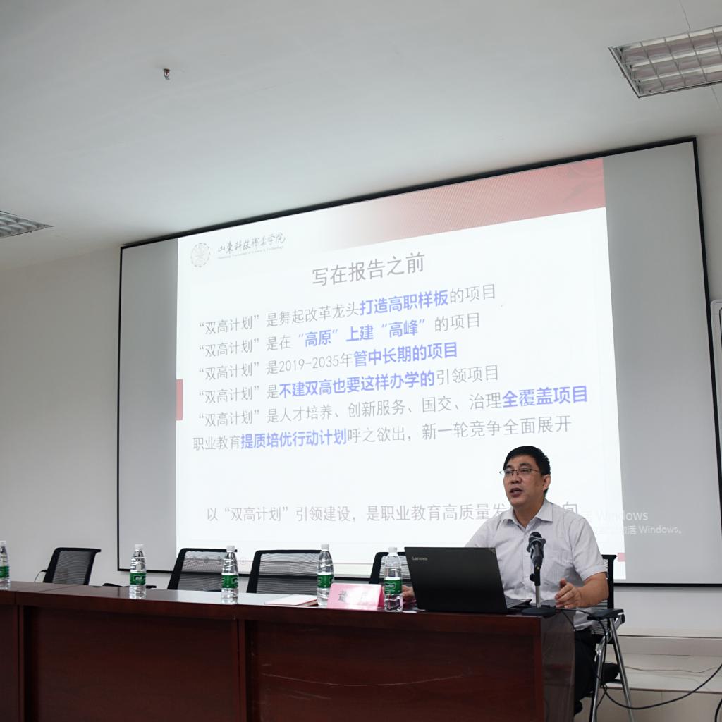为了深化产教融合,推动高等职业教育专业群建设发展,9月4日上午8:30,德赢Vwin官方区域合作伙伴教师综合能力研修提升培训班第二天培训,邀请到了现任山东科技职业学院与质量控制中心主任、学院省优质校与国家特高校创建办副主任,董传民副教授,为全院教师作专题授课。此次课程主题为“国家‘双高计划’建设,引领高职院校高质量发展的研究与实践”,在课堂上,董教授主要介绍了山东科技职业学院的印象与特色,深刻分析了双高遴选条件与评审指标以及加快职业教育发展的背景与机遇,并谈到了如何以教研教改与成果申报助力职业院校的发展。