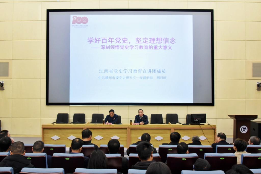 为深刻领悟党史学习教育的重大意义,学好百年党史,坚定理想信念,12月3日上午,学院邀请到江西省党史学习教育宣讲团成员、中共赣州市委党史研究室一级调研员胡日旺来校作“学好百年党史,坚定理想信念”的宣讲报告。院长黄鹏主持会议并讲话,三校在家领导班子、党员干部、学生代表聆听了宣讲报告。