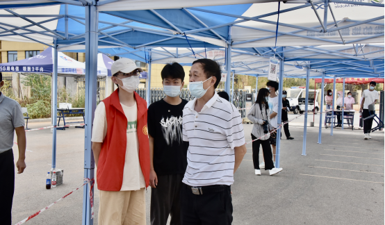 党委委员熊晓林在科技城校区查看老生返校工作,关心志愿者的身体状况。学院教师和学生志愿者们认真查看返校学生48小时内核酸检测阴性证明和“三码”,随后返校学生测温入校、报到登记、入住寝室,一切都严谨有序,有条不紊。