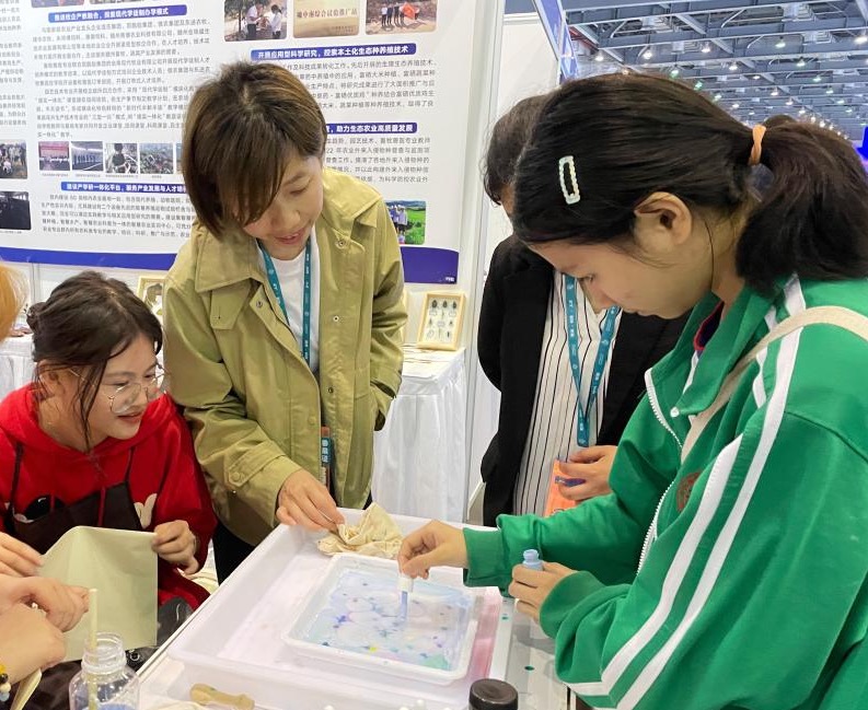 学院科研处组织艺术设计系、现代农林工程系以及动物科学系师生在会展中展示了许多特色成果。艺术设计系的活版印刷设备以及水拓画工艺吸引了众多院校师生前来体验。