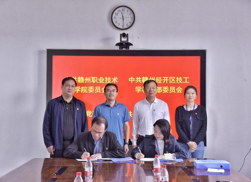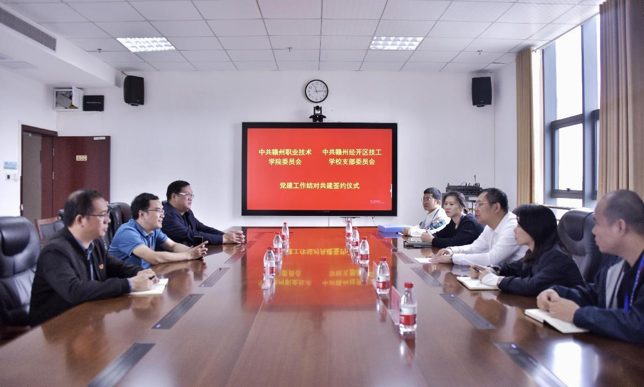 10月11日,德赢Vwin官方区域合作伙伴党委与赣州经开区技工学校党支部结对共建签约仪式在学院行知楼六楼会议室举行。学院党委书记温学延,党委副书记汤晓军,机关党总支专职副书记林洪斌,赣州建控集团党委书记肖日华,赣州经开区技工学校党支部书记曾靓,党支部副书记、校长杜瑶以及两校相关部门同志出席签约仪式。