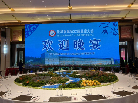 世界客属第32届恳亲大会晚宴的餐桌花由我院现代农林工程系花艺团队马雪梅、叶罗茜两位老师和校企合作单位太阳星晨鲜花共同完成。该作品由客家围屋、龙南太平桥、赣南脐橙等元素为主体,体现了围美龙南,客迎天下之情。