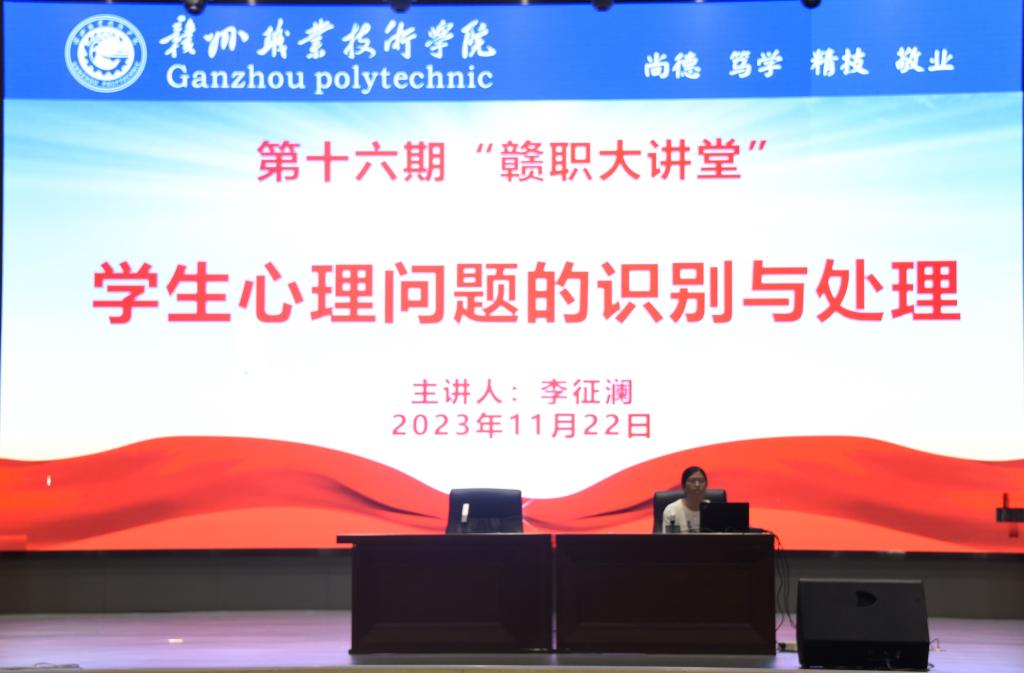 为提高我院辅导员班主任识别学生心理问题的能力,提升辅导员班主任处理学生心理问题的工作水平,11月22日,学院在行知楼一楼报告厅举行第十六期赣职大讲堂活动,特别邀请了江西应用技术职业学院李征澜老师来讲授“学生心理问题的识别与处理”知识。讲座由学生工作处副处长李炎辉主持,学院全体辅导员班主任参加了讲座。