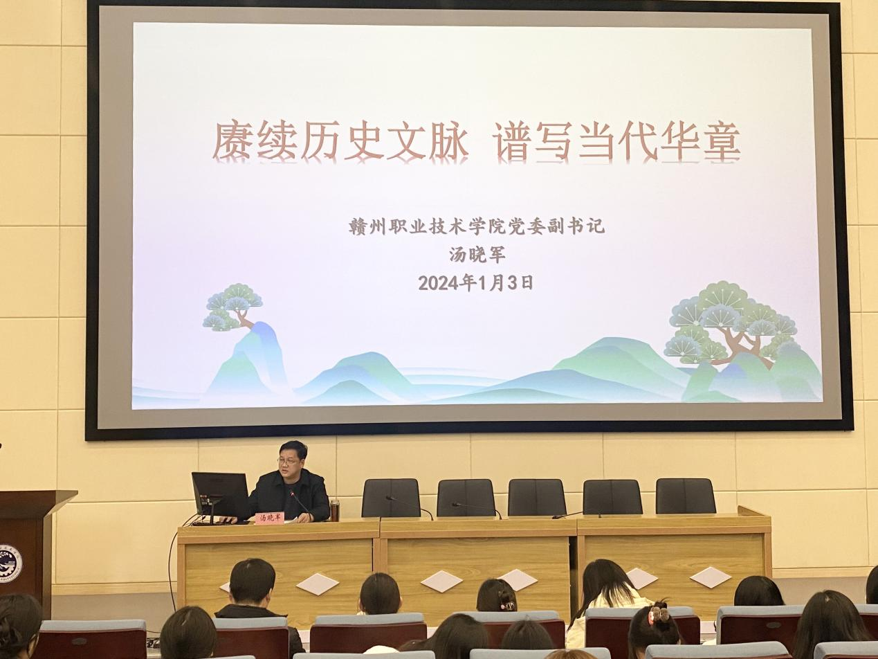 为全面推进习近平新时代中国特色社会主义思想进课堂、进教材、进头脑,提升思政课教学质量和育人实效,推动学习贯彻习近平新时代中国特色社会主义思想走深走实。1月3日下午,学院党委副书记汤晓军以“赓续历史文脉,谱写当代华章”为主题,为学院师生上思政课。