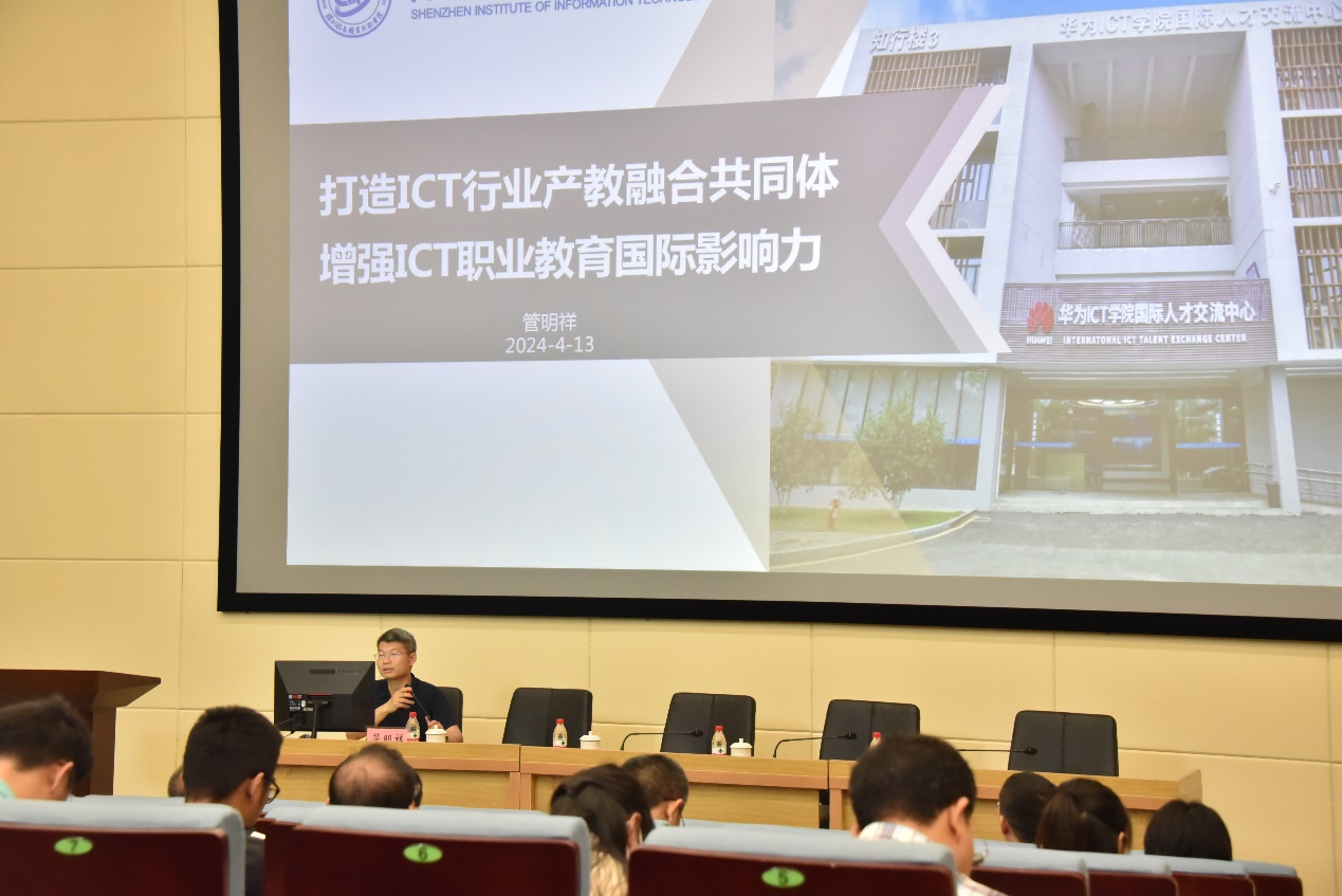 管明祥教授以“打造ICT行业产教融合共同体增强ICT职业教育国际影响力”为题,从ICT产业数字化挑战、ICT产业数字化人才培养、ICT职业教育国际化等三方面,讲解了深信院相关专业群和产业学院分层次培养系列ICT人才,将华为ICT工程师职业认证引入专业课程体系,将HCIA证书作为ICT学院学生毕业的必备证书,有效增强毕业生在移动通信技术行业内的竞争力。并从ICT产业的数字化挑战出发,聚焦ICT产业人才培养的育人定位及目标,介绍了培养复合型数字化人才的具体路径。