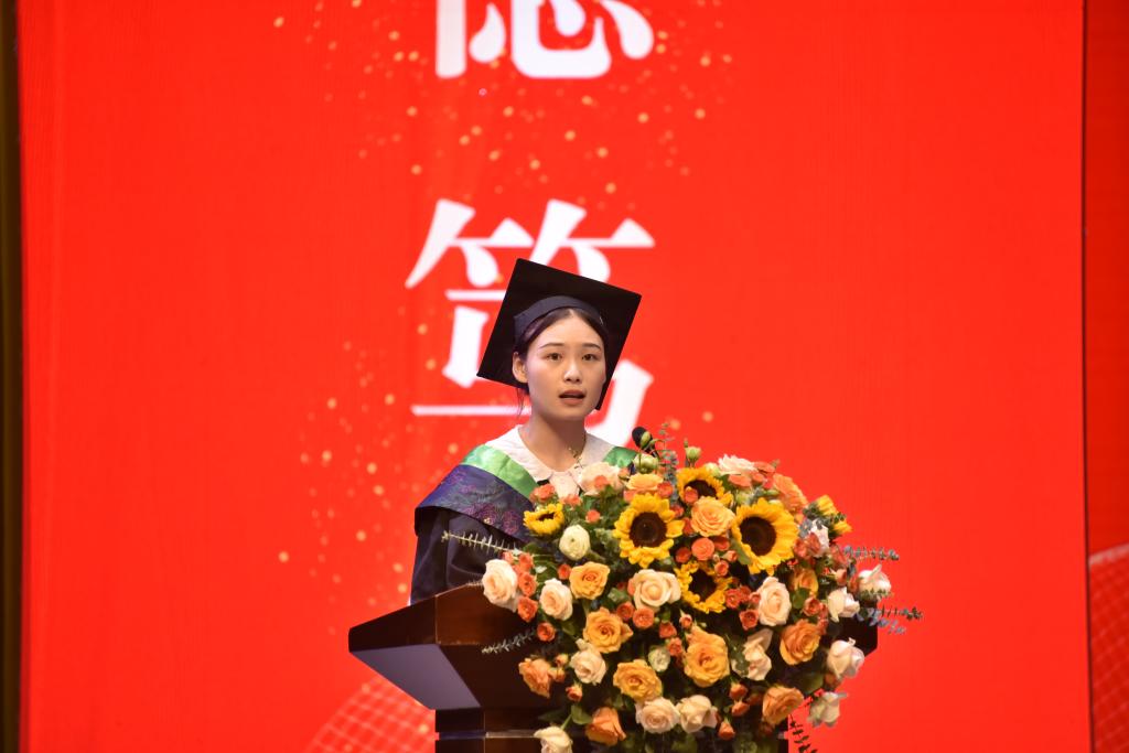 毕业生代表2021级园艺技术三年班曾佳莹同学上台发言,她回顾了在学校生活学习的点滴,表达了对母校、老师和同学的感激之情,同时也展望未来,表示将不忘初心,砥砺前行,为社会做出自己的贡献。