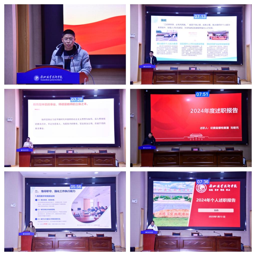 会上,18位中层干部紧密围绕“德、能、勤、绩、廉”等五方面,从工作完成情况、工作亮点、存在的问题及下一步工作计划等方面对2024年度履职情况进行现场述职。述职过程中,每位中层干部紧扣岗位职责、围绕学校高质量发展宏伟蓝图热情和工作的思考,用“成绩”说话,用“数据”报告,汇报内容讲成绩、说实话、谈举措、抓问题,亮点纷呈,各具特色。述职结束后,与会人员通过不记名评分的方式,秉持客观、公正、实事求是的原则对中层干部进行测评。