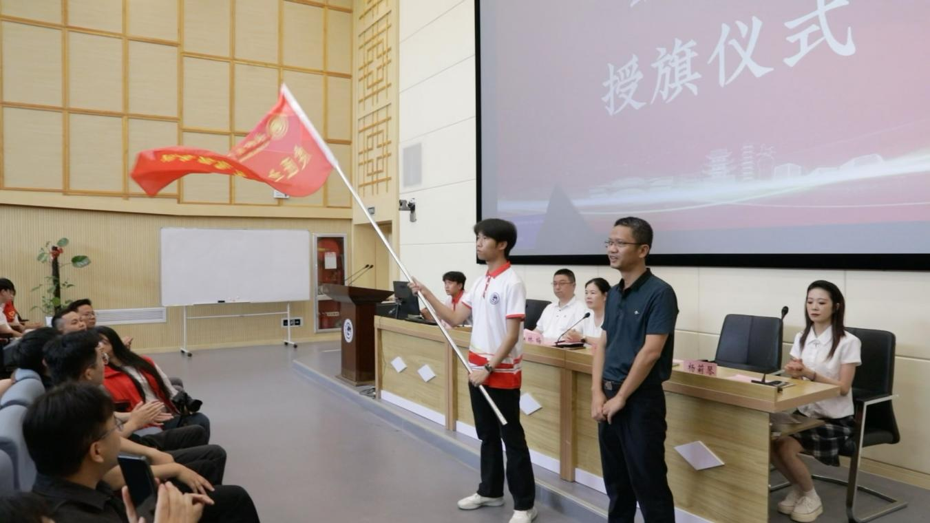 在激昂的乐曲声中,党委委员、宣传统战部部长曾卫平为校级实践团队代表授旗。鲜红的旗帜承载着学院的期望与重托,也象征着青年学子奔赴赣鄱大地、书写青春华章的坚定决心。