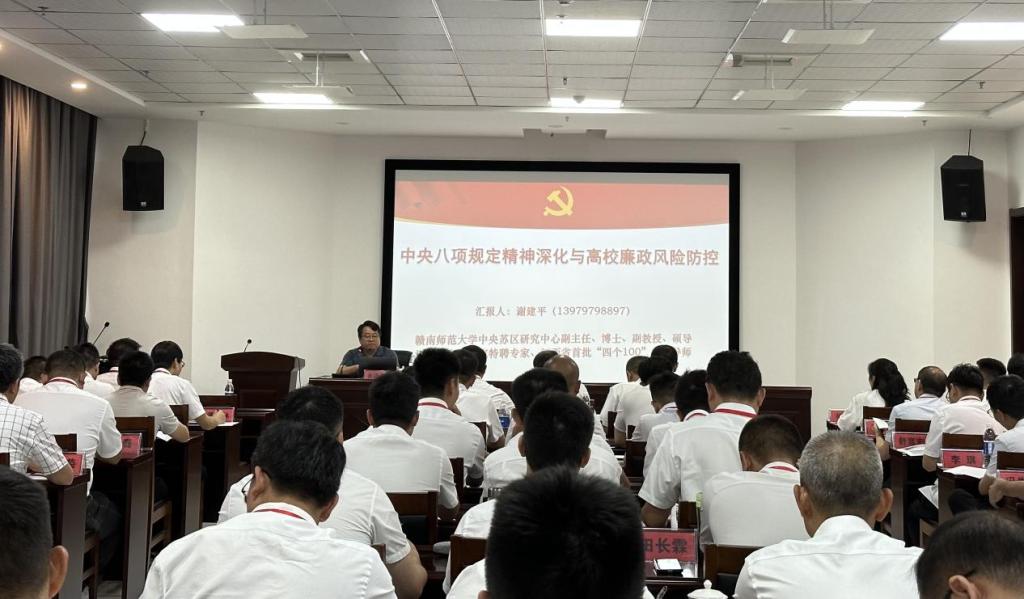 开班仪式后,赣南师范大学中央苏区研究中心副主任、副教授谢建平作主题为《中央八项规定精神深化与高校廉政风险防控》的专题报告。他从中央八项规定精神及深化解读、高校系统腐败案件简要分析与案件警示、教育系统党员干部要做廉洁自律的表率等几方面进行了详细讲授。
