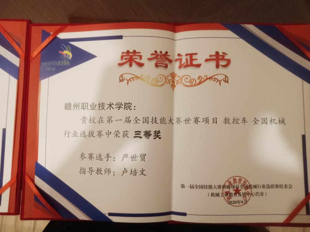 在第一届全国技能大赛世赛项目数控车全国机械行业选拔赛中,我院选手严世贸荣获三等奖。
