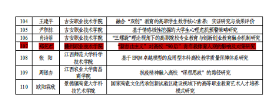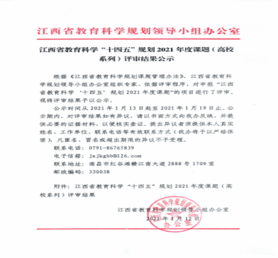 近日,从省教育厅文件《江西省教育科学“十四五”规划2021年度课题(高校系列)评审结果公示》获悉,学院思政课教师郑芝君主持的课题《“新自由主义”对高校“90后”青年教师育人观的影响及对策研究》获省教育科学“十四五”规划2021年度青年专项课题。(撰稿:黄珍英;初审:陈曦、宋华;文字编辑:杨盛钦;责任编辑:刘丹;审核:曾卫平)