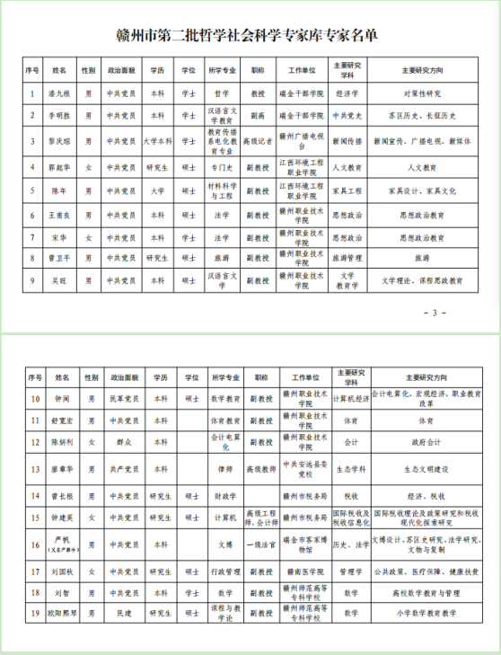 赣州市哲学社会科学专家库是市委宣传部、市社联为深入贯彻党的十九大关于“加快构建中国特色哲学社会科学”“加强中国特色新型智库建设”的精神和落实市委办、市政府办《关于加强赣州特色新型智库建设的实施意见》文件精神,由各单位推荐,经认真组织审查一批社会各界优秀人才,来有效整合和发挥社科人才资源优势,推动学科建设和社科专家队伍建设,更好地为市委、市政府科学决策服务。(撰稿:黄珍英;初审:陈曦;文字编辑:杨盛钦;责任编辑:刘丹;审核:曾卫平)