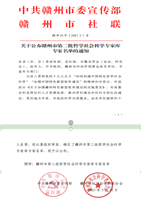 近日,中共赣州市委宣传部、赣州市社会科学界联合会公布了赣州市第二批哲学社会科学专家库专家名单,我院王甫良、宋华、曾卫平、吴旺、钟闽、舒宽宏、陈妍利等7位教师入选。