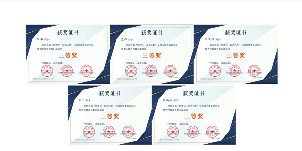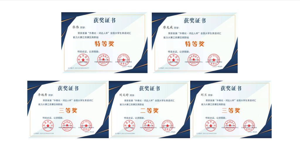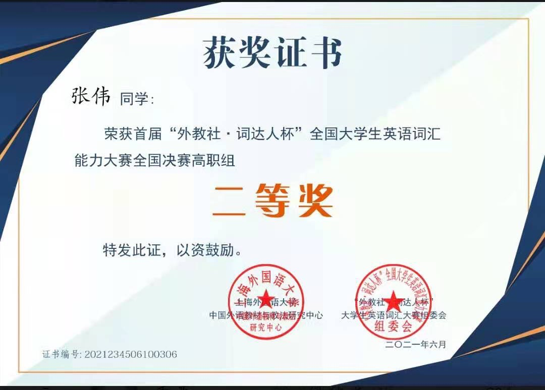 在由教育部职业院校外语类专业教学指导委员会、上海外教社外语联合举办的首届“词达人杯”全国大学生英语词汇能力大赛中,我院经过校赛、省赛、国赛三个层次的比赛中,由英语教研室主任王宝珍指导的信息工程系2020级物联网应用三年制2班张伟、廖龙威2位同学在省赛中获得特等奖,顺利进入国赛环节; 经济与人文管理系2020级会计三年制2班刘文婷在省赛中获得二等奖;朱军等7位同学在省赛中获得了三等奖。
