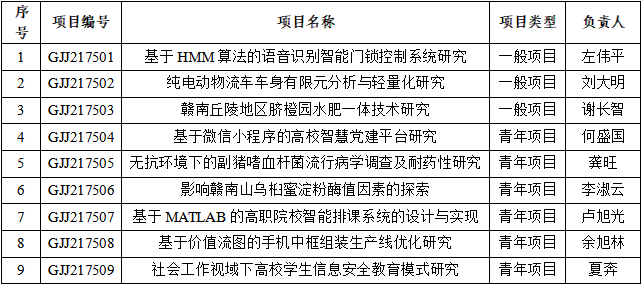 近日,从省教育厅文件《关于公布2021年度江西省教育厅科学技术研究项目立项名单的通知》(赣教高字〔2021〕63号)获悉,我院共有9项2021年度江西省教育厅科学技术研究项目获准立项,具体名单如下: