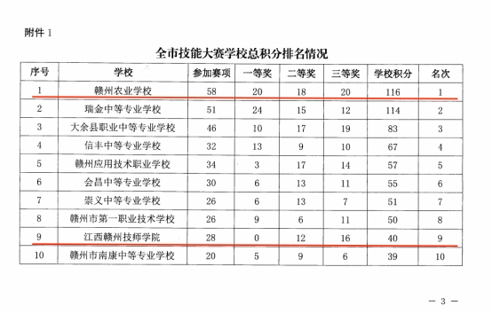 近日,由赣州市教育局印发的《关于2022年赣州市中等职业学校技能大赛获奖名单的通报》(赣市教职成字〔2022〕21号)获悉,赣州农业学校、江西赣州技师学院在全市技能大赛学校总积分排名情况中分别排行第1名、第9名。其中,赣州农业学校参赛师生获一等奖20个,二等奖18个,三等奖20个;江西赣州技师学院获二等奖12个,三等奖16个。
