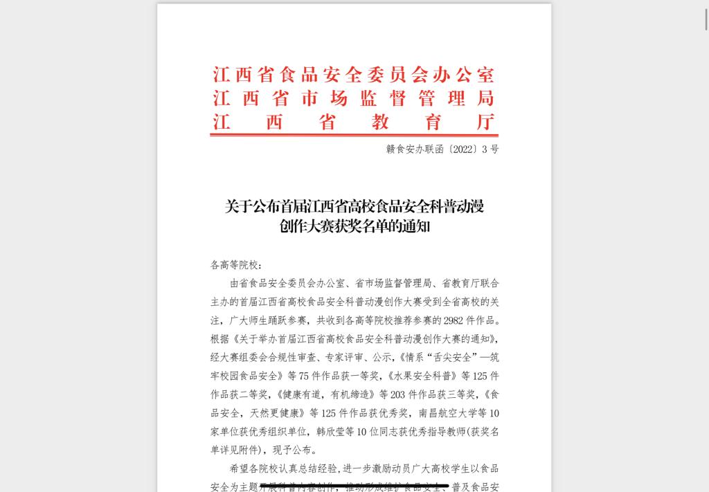 近日,首届江西省高校食品安全科普动漫创作大赛顺利落下帷幕,我院学生谢顺鑫参赛作品在比赛中获得二等奖。