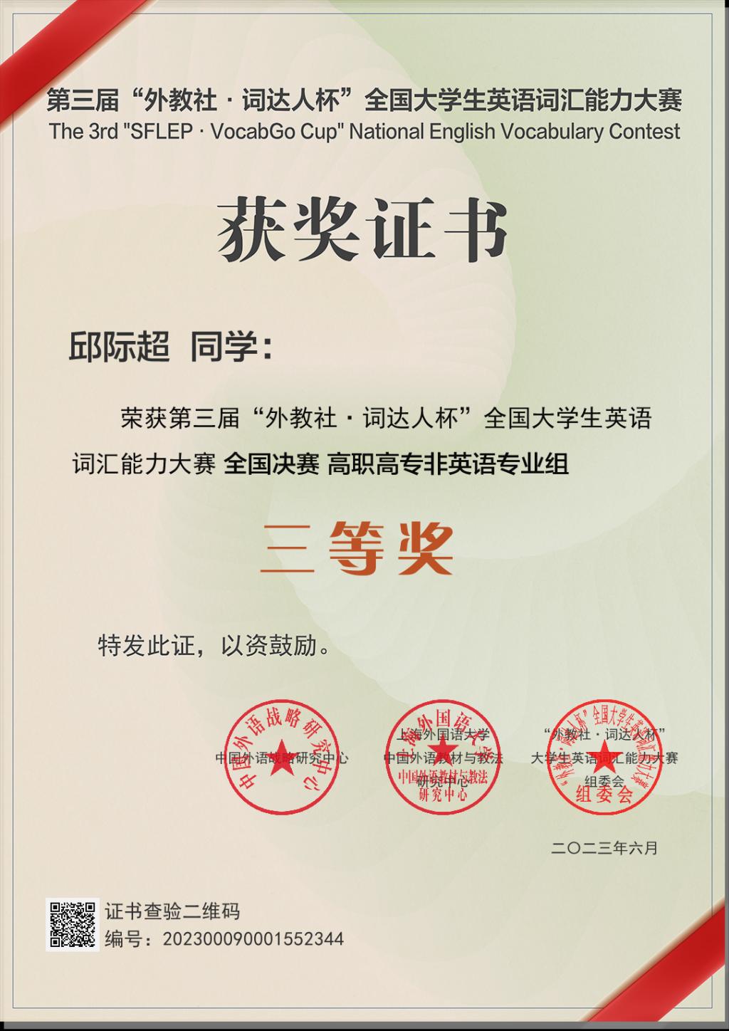 近日,“外教社·词达人杯”全国大学生英语词汇能力大赛全国决赛圆满落幕,我院汽车智能2211班的邱际超同学在谢娟娟老师的指导下以省赛一等奖的佳绩进入全国决赛,并斩获全国决赛高职高专非英语专业组三等奖。