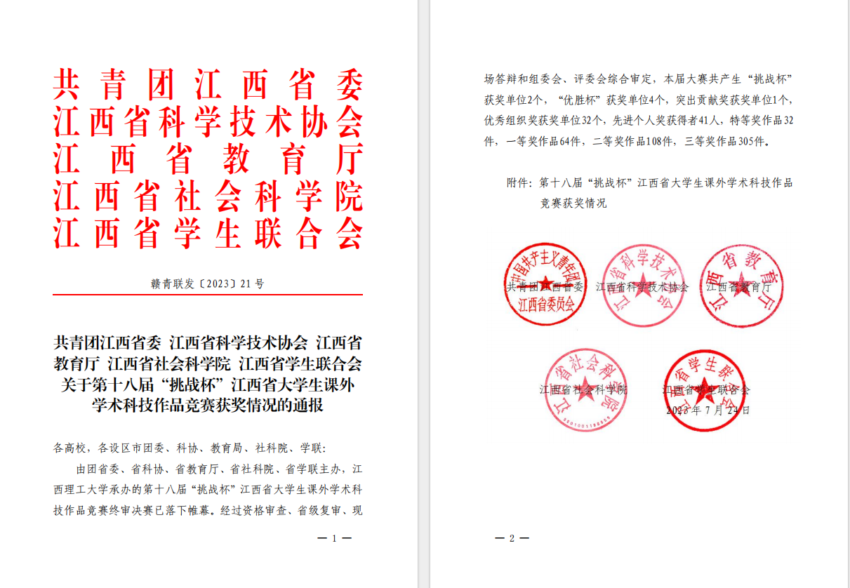 近日,第十八届“挑战杯”江西省大学生课外学术科技作品竞赛获奖情况公布,学院教师指导学生作品在竞赛中获三等奖两项。