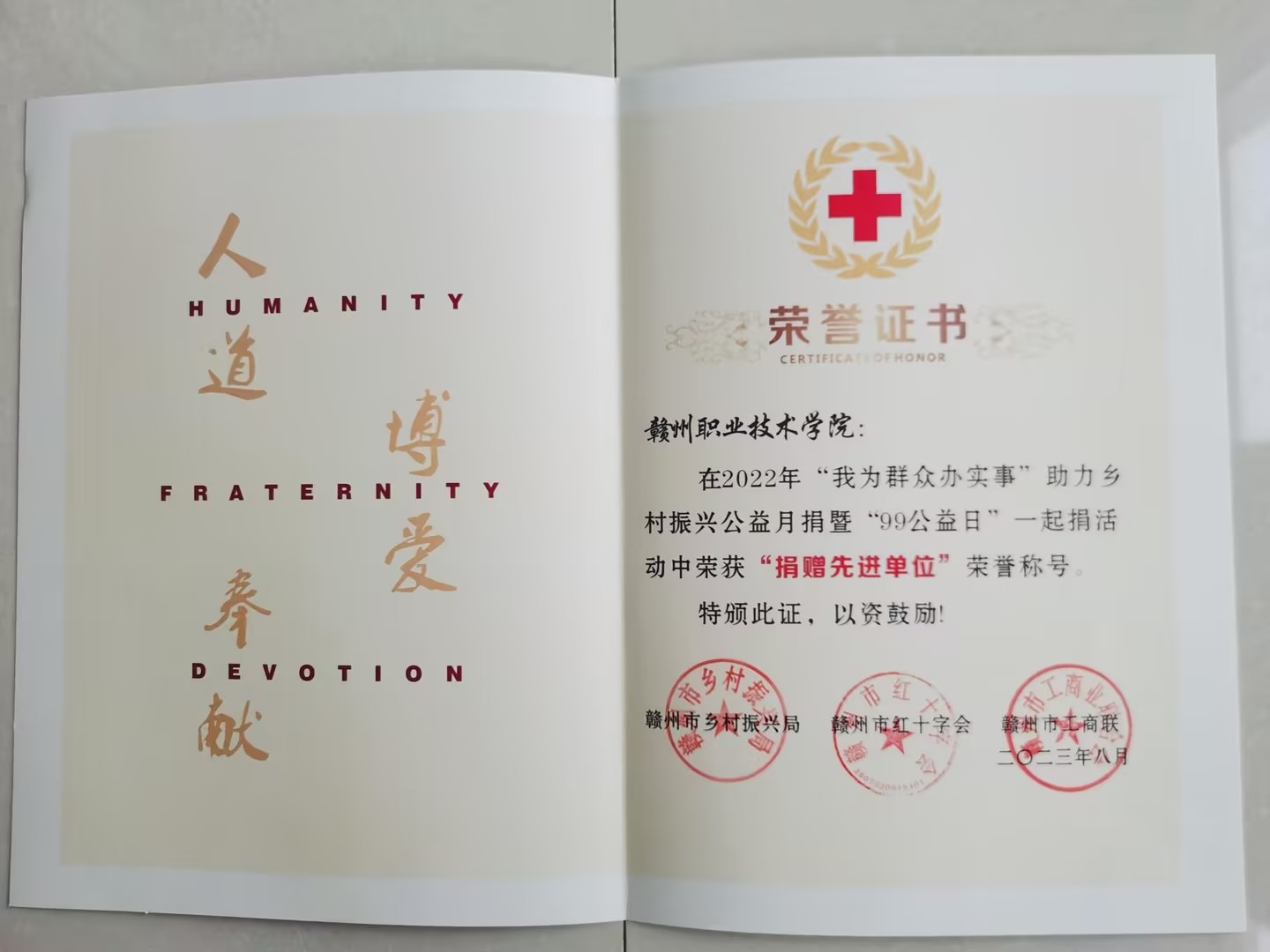 在赣州市2022年“我为群众办实事”助力乡村振兴公益捐赠活动中,学院荣获“捐赠先进单位”荣誉称号。