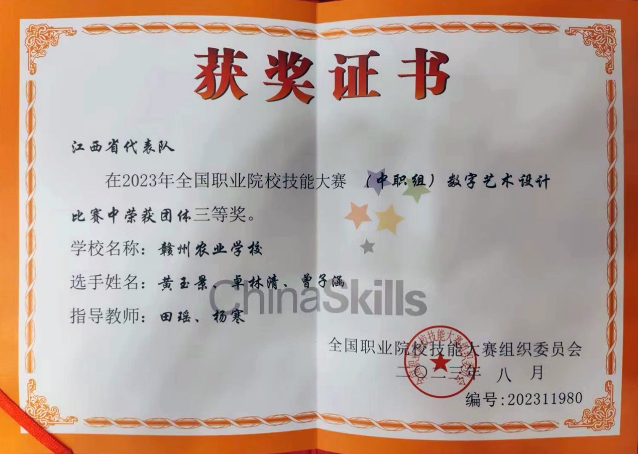 8月31日,2023年全国职业院校技能大赛(中职组)数字艺术设计赛项在江苏省南京市国际展览中心顺利开赛,经过激烈角逐,艺术设计系计算机平面设计专业学生黄玉景、卓林清、曾子涵(指导老师:田瑶、杨寒)作为江西省代表队荣获全国职业院校技能大赛首届数字艺术设计赛项团体三等奖。