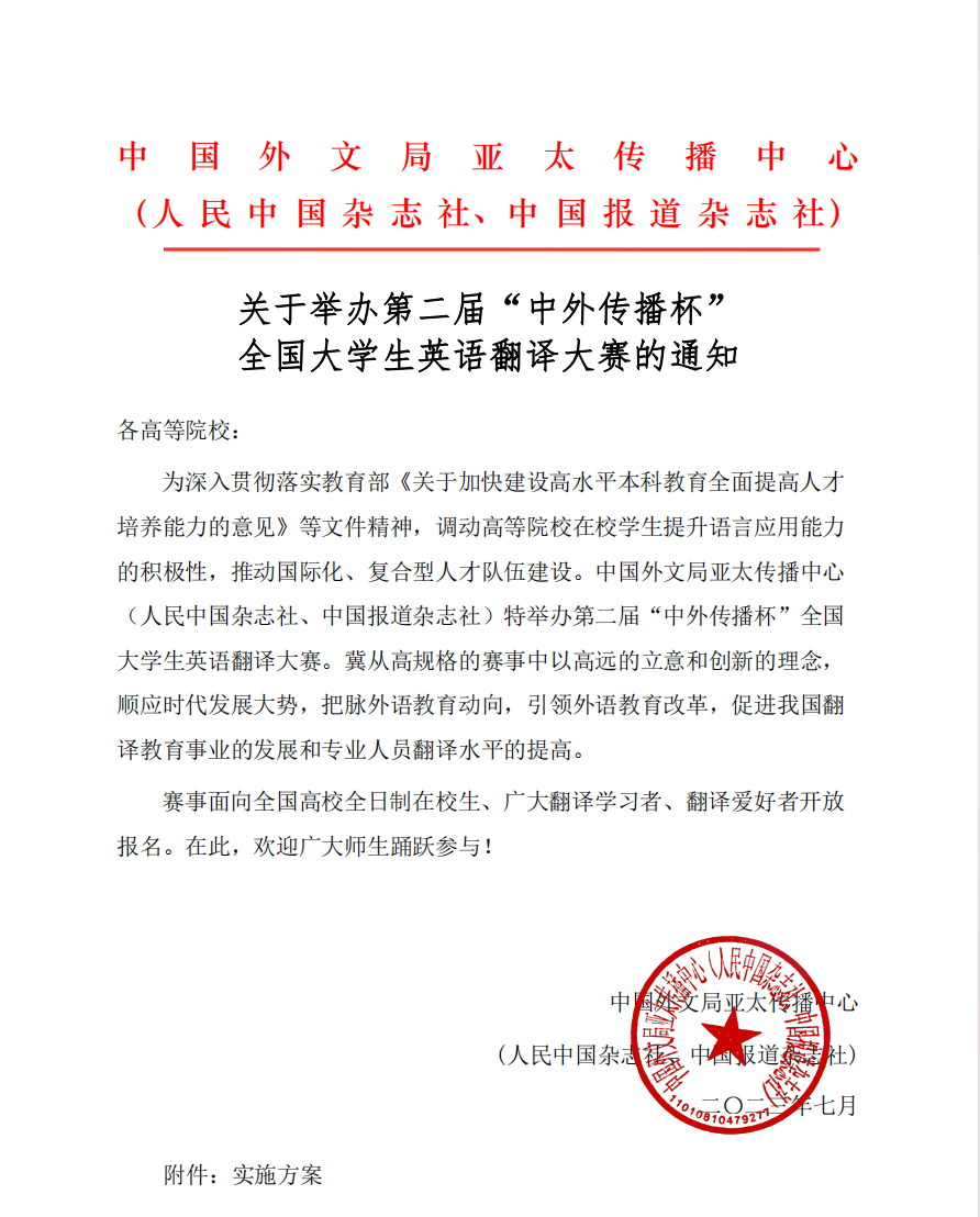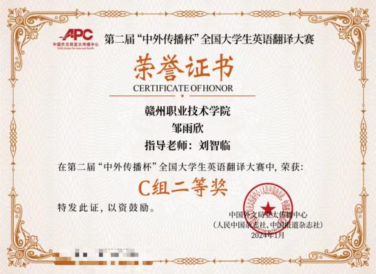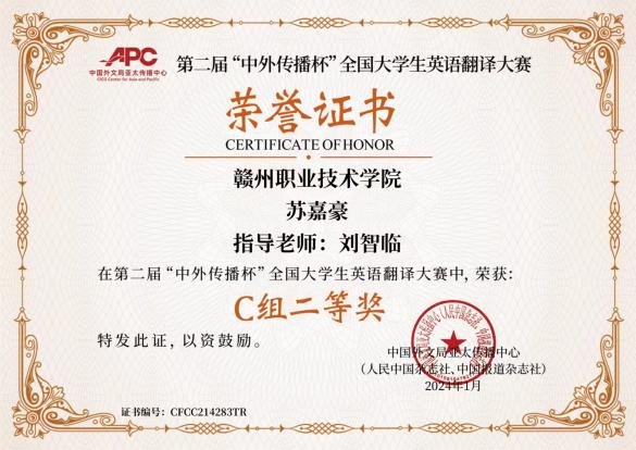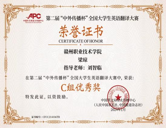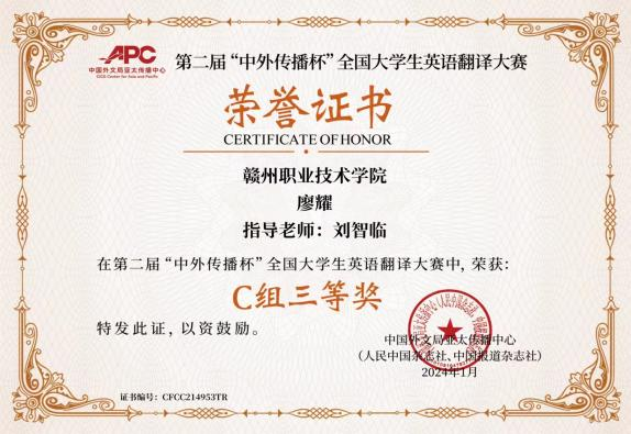 据悉,本次“中外传播杯”全国大学生英语翻译大赛是由中共中央直属事业单位国家外文局下属单位亚太传播中心举办的第二届英语翻译大赛,吸引了来自北京大学、厦门大学、四川大学、西安翻译学院等众多国内高校的近4万余名学子参加。本次比赛一等奖获奖比例为参赛人数的5%,二等奖获奖比例为参赛人数的15%,三等奖获奖比例为参赛人数的25%。本次比赛旨在提升高等院校在校学生英语应用能力的,讲好中国故事、传播好中国声音,推动国际化、复合型人才队伍建设。