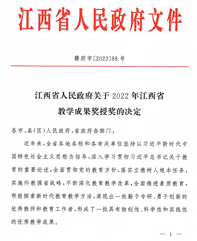 为表彰教学领域的先进典型,发挥教学成果的引领激励作用,进一步提高教育质量,办好人民满意教育,江西省教学成果奖从2022年起纳入省政府表彰常设项目,由省人民政府下发表彰决定并颁发证书,属省(部)级荣誉,每四年评审一次,获奖成果代表了江西省当前教育教学工作的最高水平和重大进展。