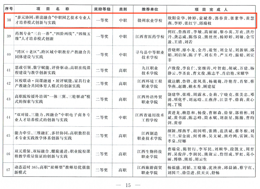 江西省人民政府于近日发布《关于2022年江西省教学成果奖授奖的决定》(赣府字〔2023〕88号),我院欧阳荣华教师团队的《“多元协同,耕读融合”中职园艺技术专业人才培养模式创新与实践》项目喜获职业教育类教学成果奖一等奖。