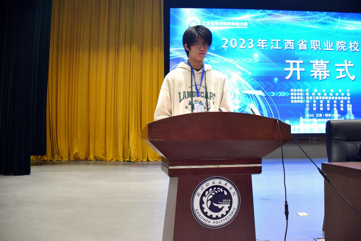 蒯海章代表大赛组委会致开幕辞,向大赛的成功举办表示热烈的祝贺,向辛勤付出努力的各位领导、老师、志愿者们表示衷心的感谢。他强调党的二十大报告中指出,要统筹职业教育、高等教育、继续教育协同创新,推进职普融通、产教融合、科教融汇,优化职业教育类型定位。习近平总书记多次强调,要加快建立构建现代职业教育体系,培养更多高素质的技能技术人才、能工巧匠、大国工匠,为全面建设社会主义现代化国家,实现中华民族伟大复兴的中国梦提供有力的人才和技能支撑。举办职业院校技能大赛,既是贯彻落实习近平总书记关于职业教育高质量发展的有力的具体的行动,也是助力江西打造三大高地,实施五大战略的重要举措。同时也是检验各个学校技能技术性人才培养质量的一个重要平台,给在座的各位同学打造了一个能够相互切磋技艺的一个舞台。