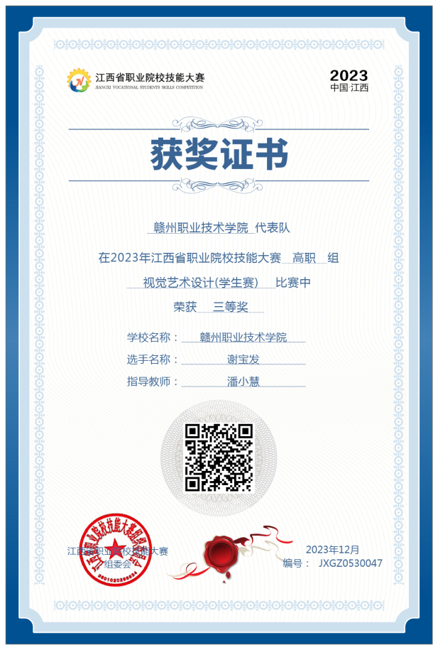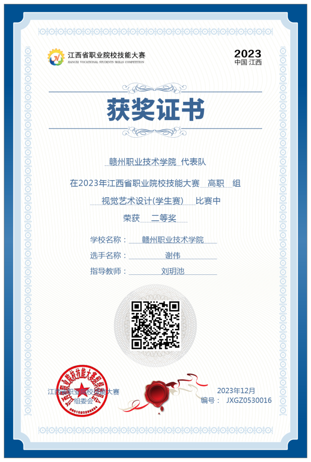12月7日,2023年江西省职业院校技能大赛(高职组)视觉艺术设计赛项在江西工业职业技术学院举办。据悉,来自全省35所院校共计82名选手参加了此次江西省“视觉艺术设计”赛项。经过激烈的角逐,由艺术设计系刘玥池老师指导的数媒2211班学生谢伟获得二等奖,由艺术设计系潘小慧老师指导的广告2212班学生谢宝发获得三等奖。
