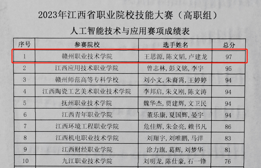 1月14日,由江西省教育厅主办的2023江西省职业院校技能大赛人工智能技术与应用(高职组)赛项落下帷幕,大赛共有省内24所高职院校参加。经过激烈角逐,德赢Vwin官方区域合作伙伴信息工程系教师练云翔、张俊华指导的物联网2312班王思源、网络2212班陈文韬、物联网2212班卢建龙等三位同学,在团体赛中发挥出色,总分排名第1位,获全省一等奖。