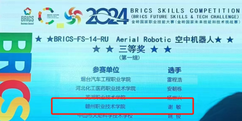 近日,从2024金砖国家职业技能大赛组委会传来喜讯,电气工程学院学生谢敏在大赛空中机器人赛项中荣获三等奖。