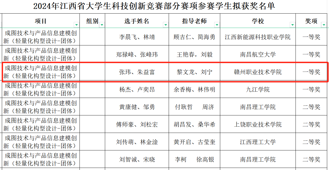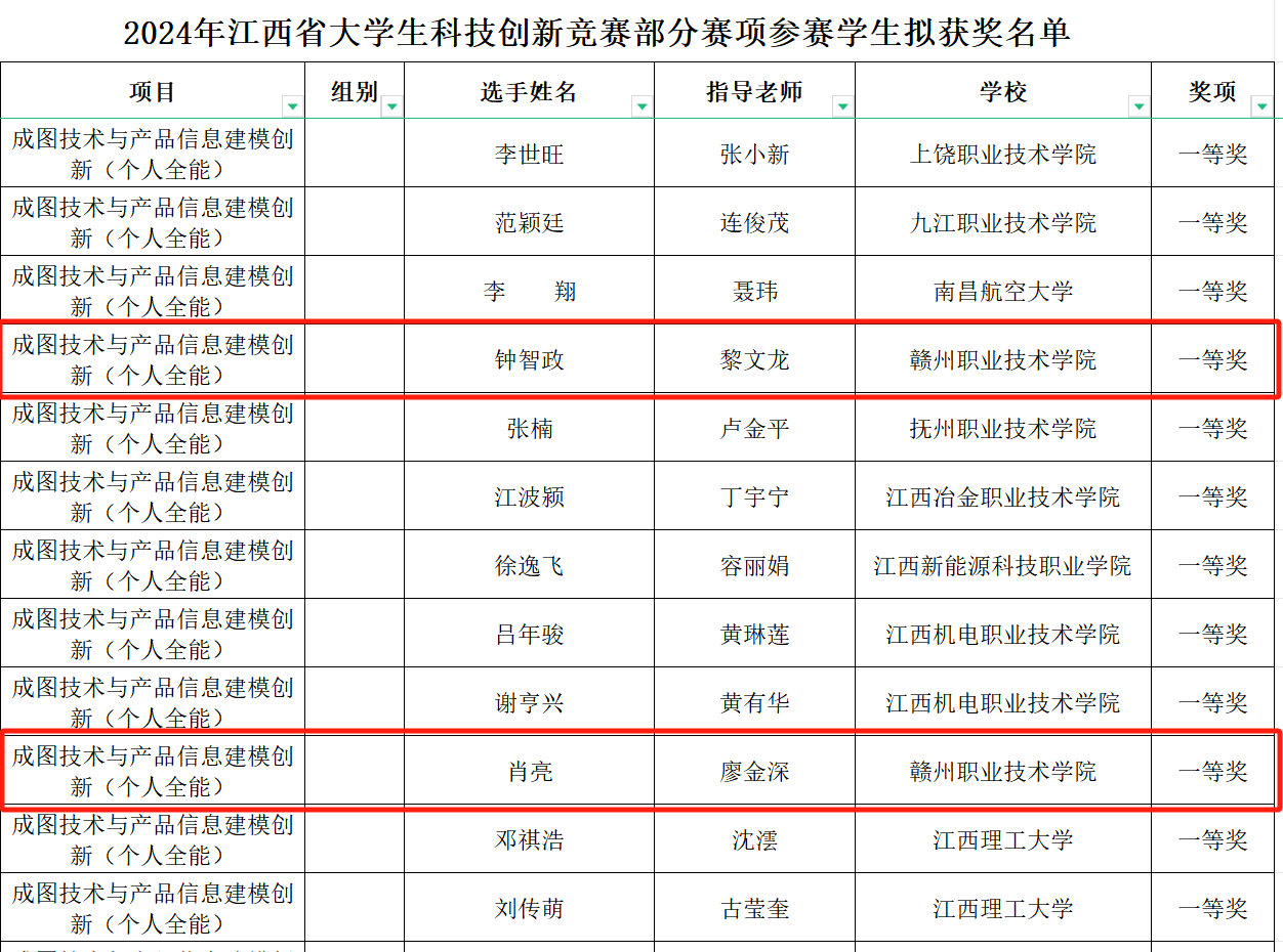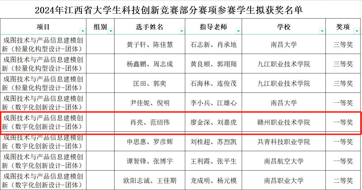 近日,由江西省教育厅公示的关于2024年江西省大学生科技创新竞赛部分赛项拟获奖名单中,智能制造学院学生肖亮、钟智政分别在成图技术与产品建模创新个人全能赛中获一等奖,张玮、朱益富在轻量化构型设计团体赛获一等奖,肖亮、范绍伟在数字化创新设计团体赛获一等奖1项。